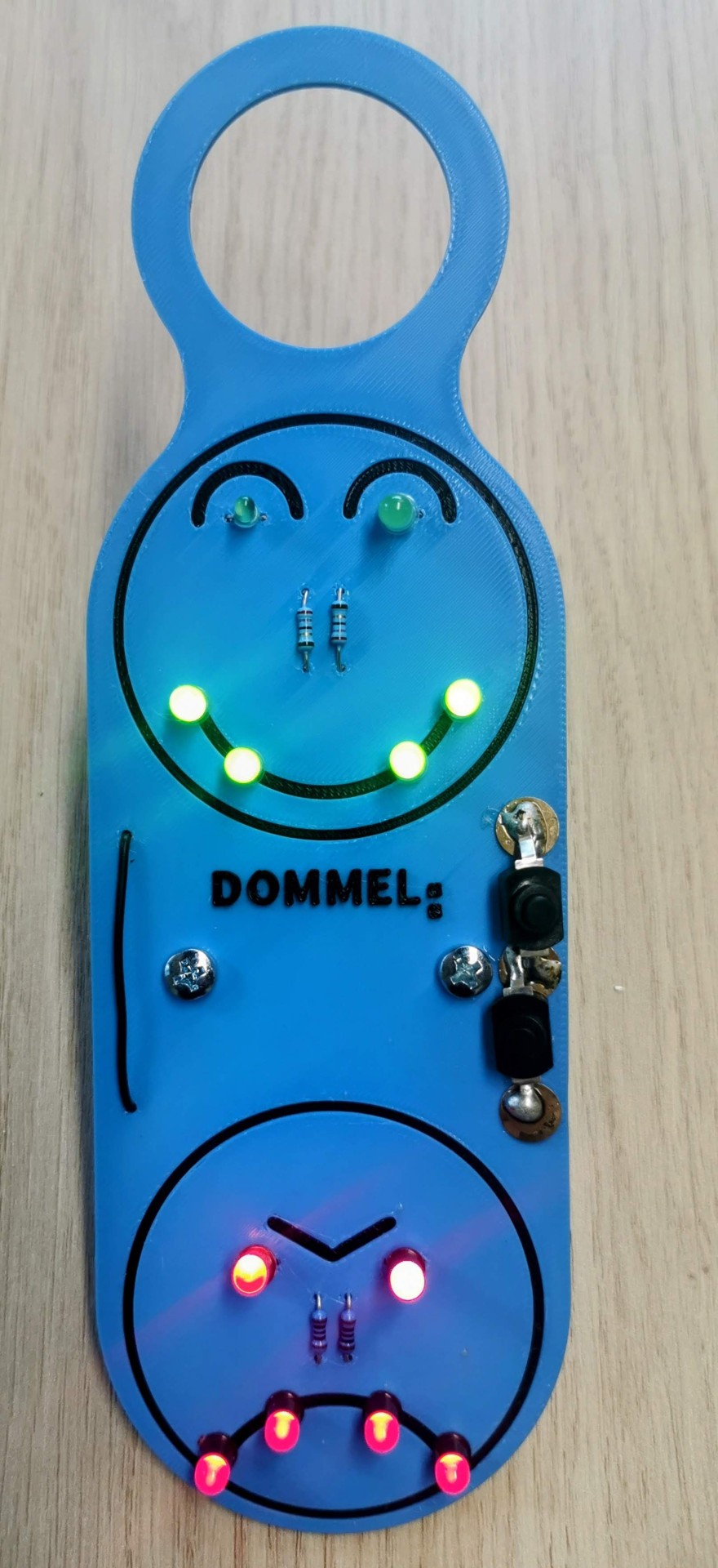 Auf Knopfdruck zeigen im oberen Smiley vier grüne LEDs und zwei grün blinkende Augen eure positive Stimmung.